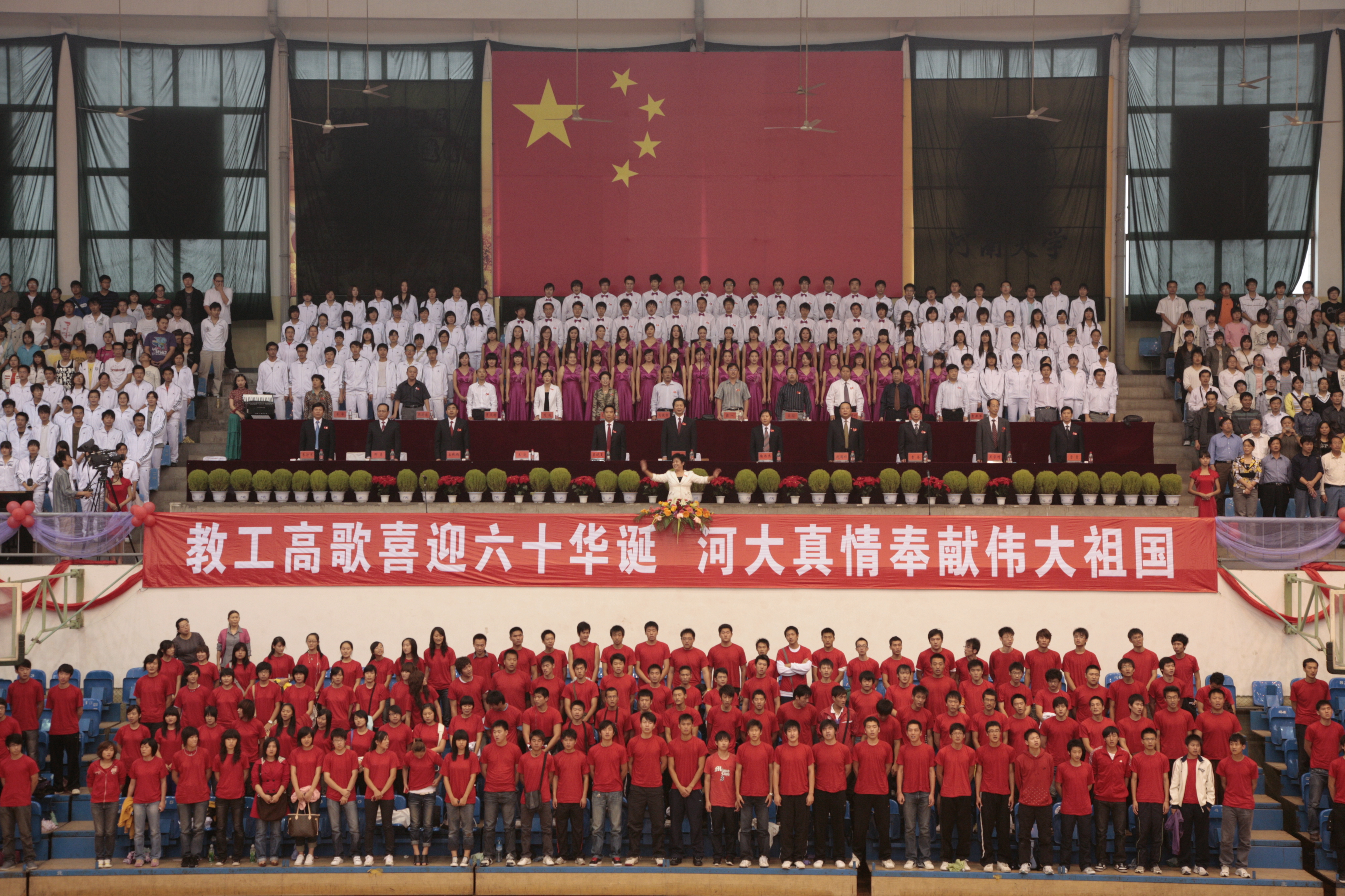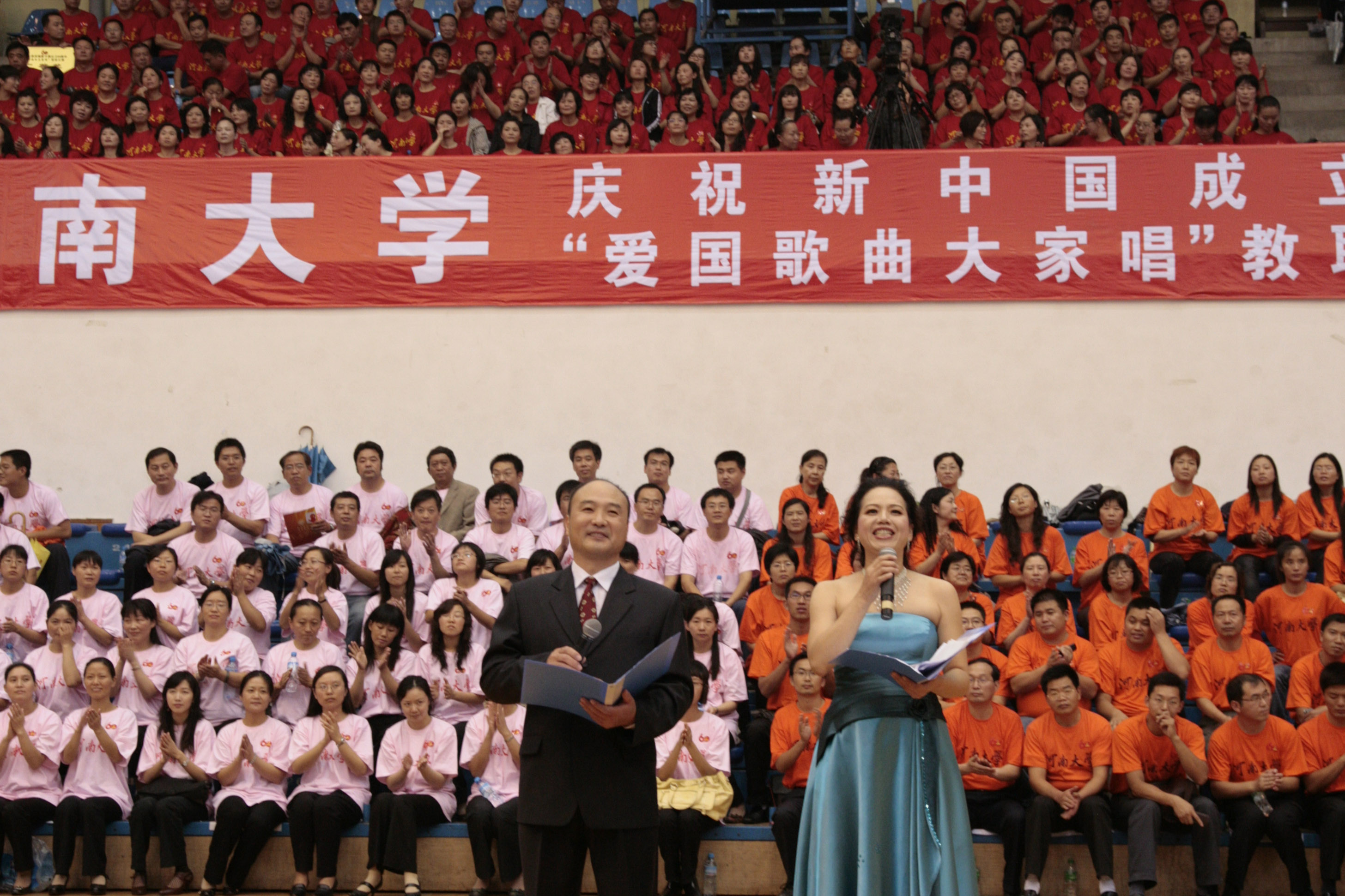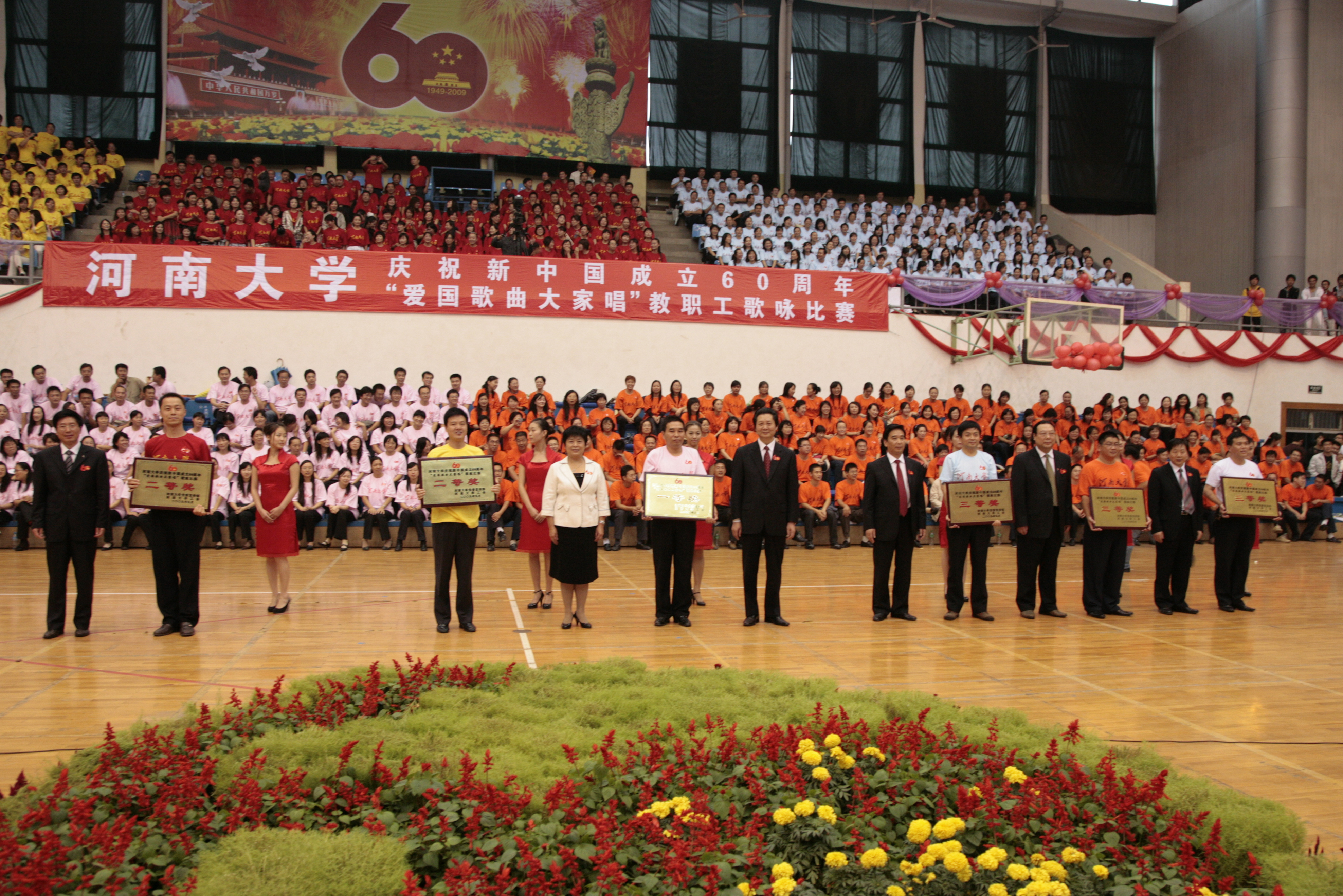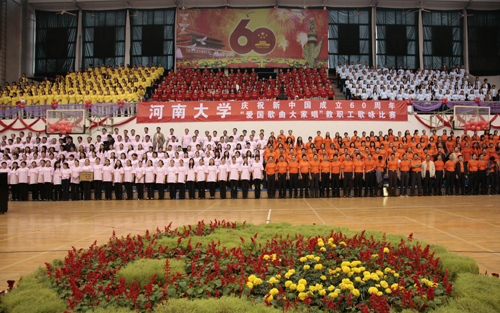 9月24日下午,明伦校区体育馆内歌声飞扬。由校党委宣传部、校工会组织的河南大学庆祝新中国成立60周年“爱国歌曲大家唱”教职工歌咏比赛在这里隆重举行。来自学校各单位的合唱队员组成6个参赛方阵竞相放歌,同唱“共产党好、社会主义好、改革开放好、伟大祖国好、各族人民好”的主旋律,为庆祝新中国60华诞倾情献礼。开封市人大党组成员、市总工会党组书记、工会主席陶书杰,开封市教育工会主任李汴军和我校领导娄源功、梁晓夏、赵国祥、王凌、曹奎、宋纯鹏、关学增、邢勇、雷霆在主席台就坐。校工会副主席娄素君、党委宣传部副部长刘波、艺术学院党委书记马俊芳与六个参赛队的代表共同出任评委,校党委副书记、工会主席王凌,党委宣传部部长李文山, 校工会副主席曹亚军担任仲裁。