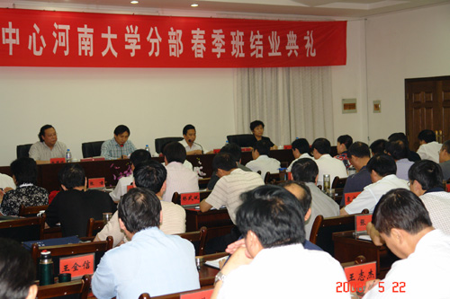 5月22日下午,河南省干部教育培训中心河南大学分部第八期县处级干部进修班结业典礼在我校干部培训中心举行。校长关爱和、校党委副书记梁晓夏、副校长赵国祥、纪委书记王凌、党委组织部及干部培训中心负责同志和进修班的全体学员参加了结业典礼。典礼仪式由梁晓夏主持。