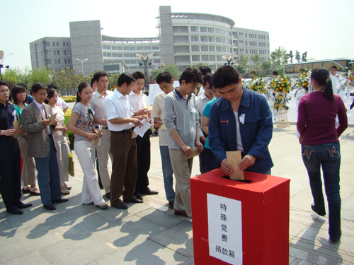 汶川大地震发生后,我校各级党组织、广大共产党员和教职工生通过捐钱捐物、义务献血、义演义卖、派出医疗队等不同形式,为灾区奉献爱心。5月19日下午,哀悼仪式后,学校部分共产党员现场为灾区交纳“特殊党费”。经统计,此次活动收到第一批“特殊党费”共计113306.3元,已于今天上午通过工商银行河南大学支行向中央组织部党费专用账户汇出。
