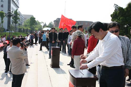 王凌宣布河南大学支援地震灾区为灾区人民捐款和献血签名活动正式开始。梁晓夏首先代表张秉义和关爱和捐款。随后,校领导、校机关全体人员和师生代表纷纷慷慨解囊并在无偿献血条幅上签名。