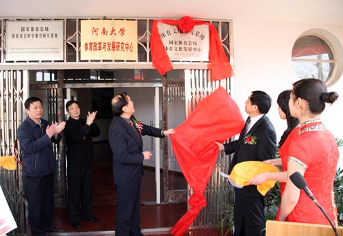 国家体育总局体育文化发展中心主任袁大任与河南大学校长关爱和一起为研究中心揭牌。国家体育总局体育文化发展中心宣教部主任王军,国家体育总局体育文化发展中心学术部副主任孙越,我校副校长宋纯鹏及相关部门负责同志参加了揭牌仪式。宋纯鹏主持了揭牌仪式。