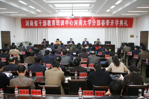 3月18日上午,河南省干部教育培训中心河南大学分部2008年春季县处级干部进修班开学典礼在我校干部培训中心举行。省委组织部干部教育处处长郭元军,正处级调研员田兰,政协河南省委秘书长、校党委书记张秉义,校党委副书记梁晓夏,纪委书记王凌,及进修班的76名学员出席了开学典礼。典礼由梁晓夏主持。