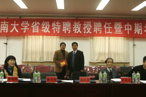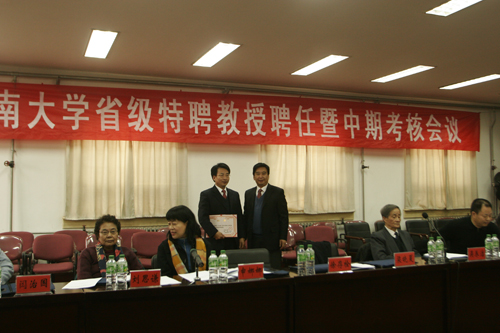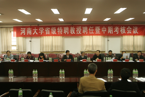 2008年1月8日,我校省级特聘教授聘任暨中期考核会议在黄河文明与可持续发展研究中心三楼会议室隆重举行。省级特聘教授考核专家组组长、中国科学院院士吴养洁教授,考核专家组成员,省教育厅高教处副处长李培俊,以及接受聘任和考核的特聘教授出席会议。校党委副书记梁晓夏向受聘人员颁发聘书,并分别就特聘教授受聘上岗和考核工作作重要讲话。聘任仪式和考核会议分别由人事处处长刘先省和吴养洁院士主持。