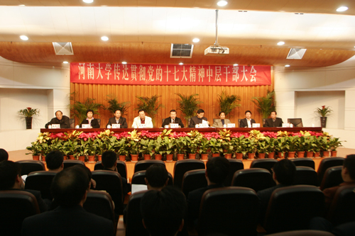 会议颁发了《中共河南大学委员会关于学习贯彻党的十七大精神的通知》(简称《通知》)。《通知》指出,当前和今后一个时期,学习贯彻党的十七大精神是学校首要的政治任务,要紧密联系学校建设发展实际,在全校迅速掀起学习贯彻党的十七大精神的热潮。