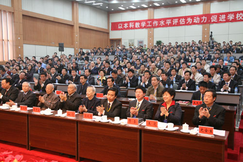 2007年10月26日上午10时40分,教育部本科教学工作水平评估专家意见反馈会在我校金明校区计算机大楼二楼报告厅隆重举行。评估专家组组长、中山大学原党委书记李延保教授等全体专家组成员,河南省人大常委会副主任李志斌,省高校工委副书记、教育厅副厅长訾新建,校党委书记张秉义、校长关爱和出席会议并在主席台就座。省教育厅有关领导,全体校领导,在我校工作的山仑院士,国家“百千万工程”入选专家,国管、省管专家,省特聘教授、黄河学者、校特聘教授;省以上人大代表、政协委员、民主党派负责人;学校正厅级以上退离休老领导,全体处级干部;教学督导组、学生工作督导组成员,联络员,学生代表等与会。会议由专家组副组长、厦门大学常务副校长潘世墨教授主持。