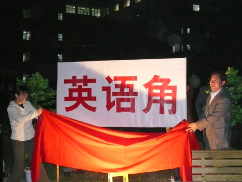 学生处崔进军副处长、大学外语教学部穆春玲副主任为英语角揭牌,现场气非常热烈。一位大四的同学激动地说:“I’m so happy to find such a wonderful place to improve my oral English before graduation”。