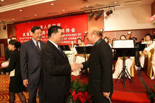 此次演出是我校艺术学院民族管弦乐团首次以高校的身份为省国庆招待酒会演奏,乐团在艺术学院副院长、我省著名指挥家陈家海教授的精心策划下,经过10余天的紧张排练,为招待酒会献上了中外经典名曲《喜洋洋》、《步步高》、《莫斯科郊外的晚上》、《友谊地久天长》及《花好月圆》等十余首作品,演出获得了巨大的成功,中外友人给予了高度的评价和赞誉。演出结束后,李成玉省长欣然接见了全体乐队队员,非常高兴地说:“谢谢你们为今年的国庆招待会献上了一道艺术大餐”。并与同学们合影留念。