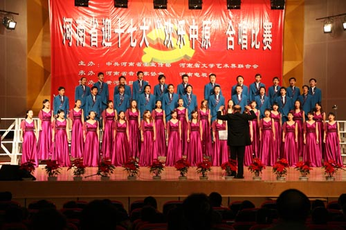 歌声嘹亮,激情飞扬。9月27日晚,由省委宣传部、省文联主办,省音乐家协会、河南电视台承办的河南省迎接党的十七大“欢乐中原”合唱颁奖展演音乐会在黄河科技学院举行,我校学生合唱团获得了本次合唱比赛特别奖。校领导孟庆琦、党委宣传部部长李文山等观看了演出。