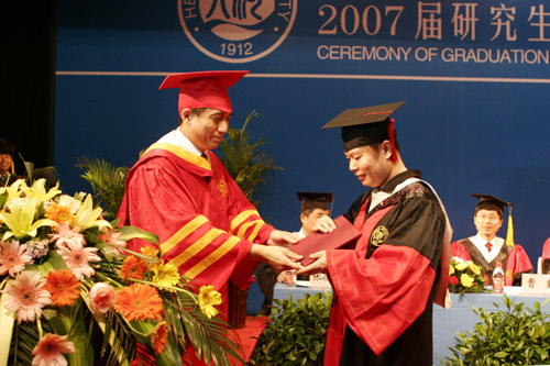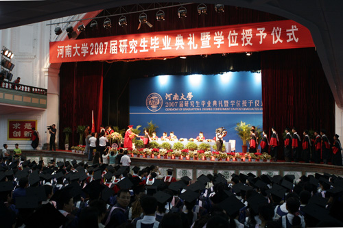毕业典礼在雄壮的国歌声中拉开序幕。工作人员宣读了河南大学学位评定委员会关于授予2007届毕业生博士、硕士学位的决定之后,校长关爱和,副校长赵国祥、曹奎分别为获得学位的博士、硕士研究生一一颁发学位证书、扶正流苏并合影留念。当同学们接过毕业证书时,闪光灯闪烁一片,而学位帽上的流苏从右拨到左的那一幕永远定格在胶片上,庄严而神圣。