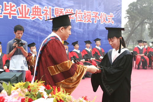 升国旗仪式结束后,校党委副书记黄亚彬教授宣读了《河南省教育厅关于表彰2007年河南省应届优秀大中专毕业生的决定》和《河南大学2007届优秀毕业生表彰决定》。2208名省、校两级优秀毕业生获得了表彰。副校长曹奎教授宣读河南大学2007届本科毕业生学士学位授予决定。之后,校长关爱和为获得表彰的省级优秀毕业生授予学位,并和大家握手,为同学们正冠拨苏。
