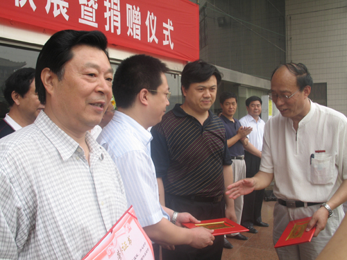 6月9日上午,我校2007年度“水墨丹心”助学活动——李群成、张文平、宋震、张良书法作品联展暨捐赠仪式在艺术学院前广场举行。中国书法家协会理事、河南省文联副主席、河南省书协副主任王宝贵同志等与我校校领导孟庆琦出席了捐赠仪式。省内多家媒体和我校各院系同学到场参加了该活动。捐赠仪式由学生处处长周保平主持。