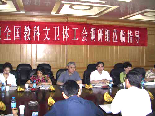 5月17日,全国教科文卫体工会调研组万明东副主席一行6人,在省教科文卫体工会主席李新江等同志的陪同下,来我校进行调研。