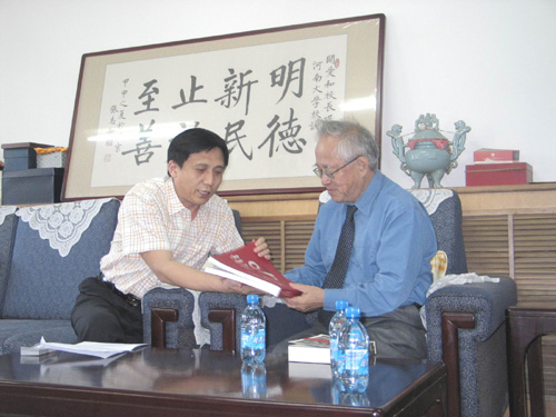在会客室,我校校长关爱和亲切会见了许靖华先生,并对许先生的归来表示热烈欢迎。关爱和同志代表学校向许靖华赠送了《河南大学校史》和《与世纪同行》画册,许先生愉快地接受了礼物并向学校回赠了自己的传记《孤独与追寻——我的青年时代》。