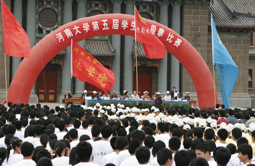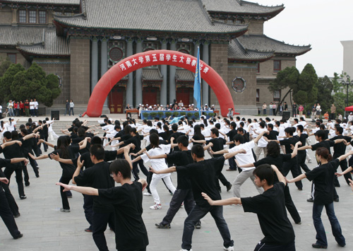 赵国祥和孟庆琦同志分别代表校党委、校行政向连日来刻苦训练的参赛同学和担任裁判、组织工作的老师表示慰问。他们说,河南大学是一所历史悠久的综合性大学,担负着为国家培养德、智、体、美、劳等全面发展的合格人才的重任。我校已经连续举办五届太极拳比赛,对促进学生综合素质的提高起到了良好的效果,他们要求同学们要认真锻炼身体,为将来更好的学习和生活做准备。并号召同学们在此次比赛中赛出风格、赛出友谊、赛出水平。