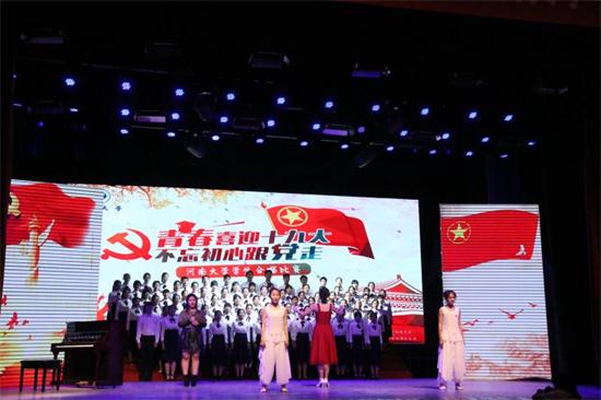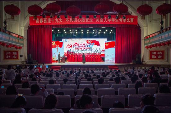 5月20日下午,由共青团河南大学委员会主办,共青团河南大学教育科学学院委员会、共青团河南大学物理与电子学院委员会、共青团河南大学经济学院委员会、共青团河南大学商学院委员会、共青团河南大学国际教育学院委员会承办的“青春喜迎十九大 不忘初心跟党走”河南大学学生合唱比赛在明伦校区大礼堂举办。校党委常委、副校长张宝明及有关职能部门领导老师出席此次活动。艺术学院相关专业老师担任评委。