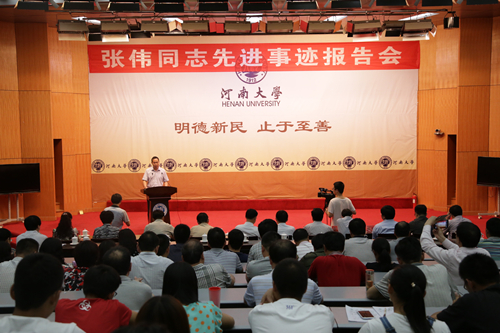 按照中共河南省委高校工委、河南省教育厅的工作安排,河南省在全省教育系统集中开展张伟同志先进事迹巡回报告活动。2014年5月20日下午,首场报告会在我校金明校区计算机大楼报告厅举行。省教育厅副巡视员赵国河,省教育厅师范教育处处长朱自锋、副处长田少辉、主任科员夏青,《教育时报》总编辑刘肖等出席报告会。校领导关爱和、梁晓夏、王凌、雷霆、朱恒宽,全体中层干部,师生代表以及第33期全省高校中青年干部培训班的学员一起参加了报告会。报告会由校党委副书记王凌主持。