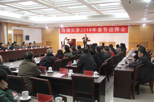 校长娄源功代表学校党委和行政致新年贺词,他说,2013年,是我校事业发展进入新百年的开局之年。全校师生同心同德,协力奋进,事业发展成绩斐然、亮点频现,各项工作均取得了新的进展、新的成效,为增强学校核心竞争力和创建国内一流大学奠定了更加坚实的基础。经过艰苦努力,省政府同意按中西部高校提升综合实力建设标准,一次性投入4.5亿元资金重点支持学校内涵发展,这在我校百年发展史上尚属首次。我校新增本科教学工程国家级项目9项、省级项目27项。39个学科参加第三轮学科评估,8个学科进入全国前20名,15个学科进入第20-40名,15个学科进入第40-60名,一个学科排第62名。获得国家社科基金重大招标项目1项,国家社科基金项目33项;国家自然科学基金项目80项,立项数和资助经费总额再创新高。另外,我校在师资队伍建设、对外交流与合作、学校管理创新工作、民生工程建设等方面均取得了新的成绩。