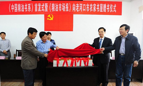 5月24日,我校出版社新书《中国粮油书系》首发式暨粮油市场报向农家书屋赠书仪式在湖北省老河口市举行。我校出版社总编辑张云鹏、粮油市场报社长邱清龙等共同为《中国粮油书系》系列图书揭幕。