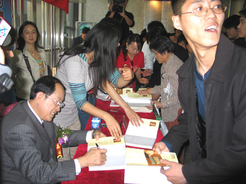 当天下午1点,等待签字的热心读者已排起了长龙。在简短的仪式之后,王立群教授顾不上休息就开始了签名。参加签名的读者中,有年逾七旬的老者,有刚步入校门的小学生,他们见到喜爱的主讲人非常兴奋,纷纷和王立群交谈合影。面对每一位读者,王立群教授总是面带笑容,适时的问候几句。签售现场热情四溢而又井然有序。据西单图书大厦销售部经理张峥介绍,从当天下午1点30开始,在四个多小时的签书活动中,共签售《王立群读< 史记>之汉武帝》近万册。