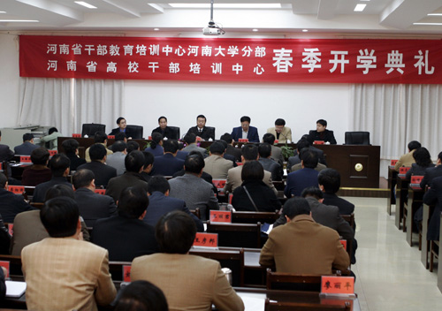 3月20日上午,河南省干部教育培训中心河南大学分部第一期县处级地方党政领导干部进修班、河南省高校干部培训中心第十九期中青年干部培训班春季开学典礼在我校干部培训中心举行。河南省委组织部干部教育处处长郭元军、副处长陈志伟,河南省委高校工委、省教育厅组织干部处处长丁松林、副处长宋辉,我校党委书记张秉义、副书记郑邦山等领导同志以及校党委组织部、干部培训中心负责同志出席了开学典礼。典礼仪式由郑邦山同志主持。