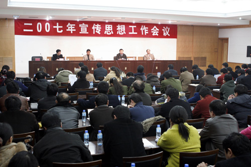 3月15日上午,我校2007年宣传思想工作会议在明伦校区新行政楼第四会议室召开。校党委书记张秉义、副校长梁晓夏、副校级调研员孟庆琦、党委宣传部部长李文山等在主席台就座。各基层党委、党总支、直属党支部书记、副书记、总支办公室主任、团总支书记,机关各部处党支部书记以及部分师生通讯员代表与会。会议由孟庆琦同志主持。