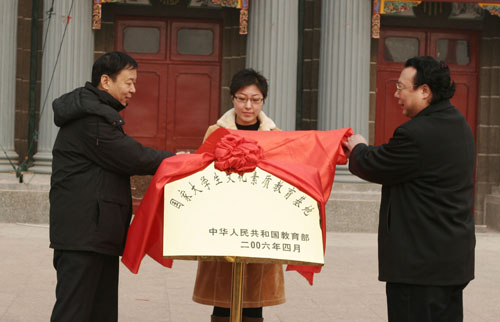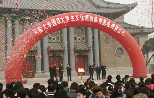 2007年1月16日上午,河南大学“国家大学生文化素质教育基地”揭牌仪式在大礼堂广场隆重举行。省教育厅高教处长张大策,省旅游局副局长李亚白同志等参加第三届“情暖校园”困难学生资助工作会议、给予我校贫困生捐助的各位嘉宾,校领导张秉义、黄亚彬、赵国祥、丁庭选、宋纯鹏等出席仪式。揭牌仪式由校党委副书记黄亚彬同志主持。