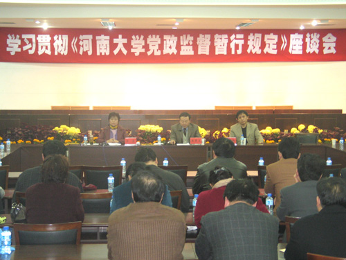根据中央《建立健全教育、制度、监督并重的惩治和预防腐败体系实施纲要》、省委《关于加强高等学校反腐倡廉工作的意见》,把我校反腐倡廉工作进一步引向深入,在调查研究、充分酝酿、发扬民主的基础上,经校党委常委(扩大)会议研究,我校于2005年11月23日颁发了《河南大学党政监督暂行规定》。此后,校纪委、组织部、宣传部联合通知全校各部门、各单位,要求认真组织学习、宣传、贯彻活动。在党政监督暂行规定颁布实施一周年之际,学校召开这样的座谈会,旨在总结经验,查摆不足,创新机制,推进落实,进一步开创我校反腐倡廉工作的新局面。