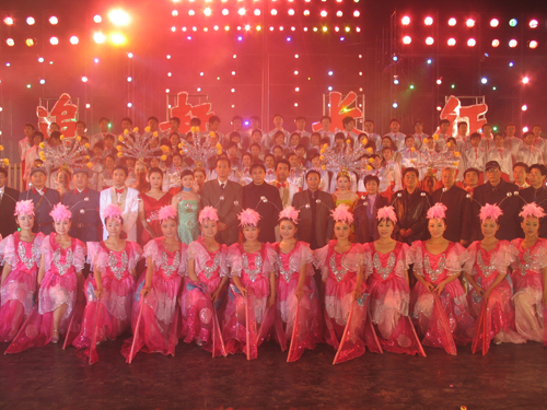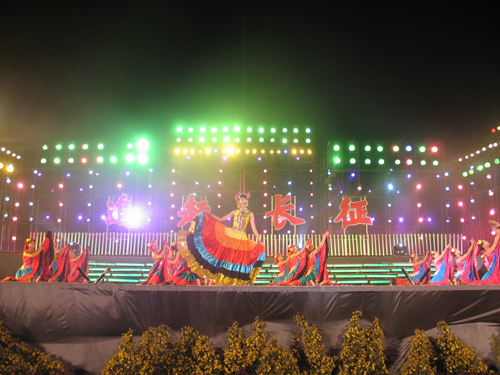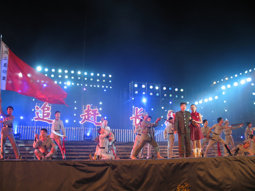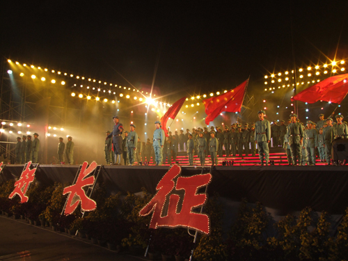 由省委宣传部、省委高校工委、省教育厅主办,我校承办的“追赶长征”纪念长征胜利70周年大型歌舞晚会日前在郑演出取得了极大成功。省领导徐光春、王全书、孔玉芳、李柏拴、叶青纯、祁正祥、曹维新、夏清成、王菊梅等观看了演出,并给予高度评价。学校决定要把这份视觉盛宴和精神大餐呈现在我校学子面前,让同学们感受到长征精神的伟大和我校浓厚的艺术氛围。在校党委的统一领导下,党办、校办、宣传部、学生处、团委、校园管理处、后勤服务总公司、出版社、成人教育学院、艺术学院、体育学院、新闻与传播学院等单位迅速行动起来,克服天气寒冷、两校区交通不便等困难,确保演出的顺利进行。经过紧张筹备,2006年11月12日和13日晚,晚会在金明校区礼仪广场连续演出两场。校领导关爱和、黄亚彬、丁庭选、王凌、王发曾、赵振海、孟庆琦,各职能部门负责同志与我校数万名学子一起观看了演出。