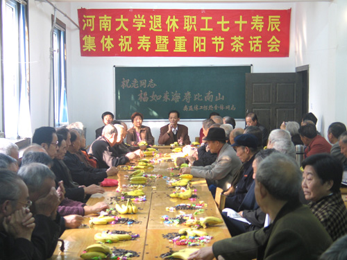 2006年10月30日,是我国的传统节日重阳佳节。当天上午,我校离退休活动中心230室内暖意融融,欢声笑语不断。由离退休工作处组织的退休职工七十寿辰集体祝寿暨重阳节茶话会在此举行。我校60余位已至古稀之年的老同志与会。校党委副书记黄亚彬到会祝贺。会议由离退休工作处副处长王广福主持。