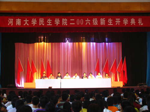 上午9时,开学典礼在庄严雄壮的《国歌》声中开始。黄亚彬同志代表校党委、行政和全校师生向2006级新生致以热烈的欢迎与美好的祝愿,并详细介绍了民生学院的发展情况、办学规模及学科建设和河南大学的概况,他指出民生学院依托河南大学深厚的文化学术底蕴,发挥河南大学的优势,拓宽办学思路,不断提高教学质量,由最初5个专业不足150余人发展到现在24个专业4000余名学生,取得了良好的办学声誉。
