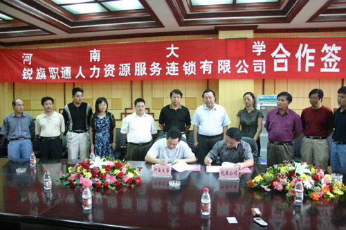 7月24日,河南大学与广州锐旗职通人力资源服务有限公司(简称旗锐公司)关于设立“锐旗人力银行河南大学工作站”的合作签字仪式在校办公楼二楼会议室举行,锐旗公司董事长杨希宏,旗锐人力银行CEO刘湘勇,河南大学副校长赵国祥,校学生处、部分学院领导参加了签字仪式。