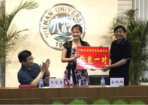 在欢送会上,副校长宋纯鹏代表学校接受了出国学生代表向母校赠送的纪念品。副校级调研员王发曾向出国留学生代表赠送了纪念品,并对即将走出国门的60多位学生表示祝贺,希望他们能够突破语言方面的障碍,迅速适应当地的生活,用优异的成绩来回报学校和老师。
