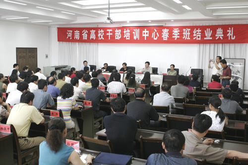 6月16日上午,河南省高校干部培训中心第十七期中青年干部培训班结业典礼在我校干部培训中心隆重举行。省高校工委、教育厅组织干部处处长丁松林、副处长熊光慈,校党委副书记郑邦山、黄亚彬,校党委组织部有关负责同志以及来自全省60余所高校的77名中青班学员参加了典礼。典礼仪式由黄亚彬同志主持。