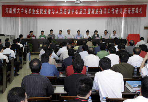5月23日上午,河南省大中专毕业生就业指导人员培训中心成立暨就业指导工作研讨班开班典礼在河南大学干部培训中心隆重举行。典礼由省教育厅学生处处长石品主持。省就业中心副主任吕冰宣读了《河南省教育厅关于在河南大学设立河南省大中专毕业生就业指导人员培训中心的通知》,全国大学生就业指导服务与信息咨询中心办公室主任国乐,中共河南省委高校工委副书记、省教育厅副厅长訾新建,我校党委副书记郑邦山、副校长赵国祥共同为“河南省大中专毕业生就业指导人员培训中心”揭牌。