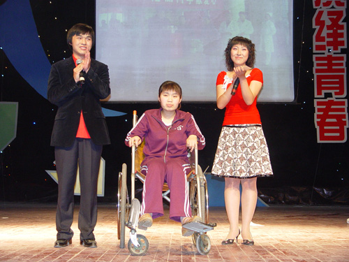 剧目《青春舞曲》、《Tell Me Why》和《CUBA开赛啦!》作了精彩的汇报演出。获奖剧目《风雨彩虹》中的主人公原型,我校化学化工学院学生侯艳丽即将离开母校奔赴武汉大学攻读硕士研究生,为表达师生对她的祝福,侯艳丽同学也被邀请到现场并接受了主持人采访。她激动地说:“是母校培育了我,给了我第二次生命,河大是我永远的家!”随后,她从轮椅上艰难的站了起来,用这种特殊方式向大家表示感谢,全场报以长时间的掌声,许多观众流下了泪水。之后,一曲《明天会更好》表达了我校师生对侯艳丽的美好祝福,观众也齐声共唱,把晚会推向了高潮。
