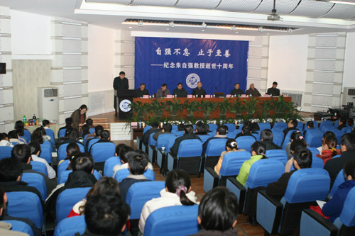 校长关爱和在致辞中介绍了朱自强先生的生平及对河南大学的贡献。他说,先生热爱祖国、忠诚党的教育和科学事业,具有强烈的民族自豪感;他学风严谨,生活勤俭,严于律己,乐观豁达;他不遗余力地关心、指导、帮助年轻人的成长,在生活和科研上带动和影响了一大批人;他知识渊博,才华横溢。关爱和认为,朱自强先生的一生是奋斗不息的一生,他为河南大学理科学科发展做出的贡献,他崇高的精神和人格,他为河南大学创建的科研基地和取得的科研成就将永远成为我校进一步发展的基石。
