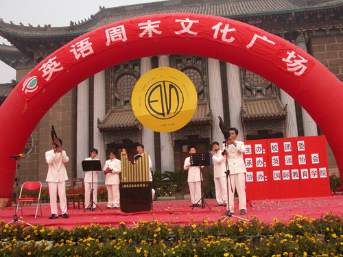 我校老年大学英语口语班的学员的表演也是整场演出的亮点,这些白发苍苍的老人不仅为观众献上了《My heart will go on 》、《友谊地久天长》两首英文歌曲,而且还有精彩的《说唱开封》表演,他们良好的精神状态及学习英语的狂热,营造了此次周末文化广场的特殊“英语”气氛,也把在场观众学习英语的积极性充分调动了起来。