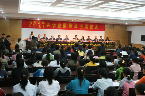 在颁奖及捐赠仪式开始前,我校党委书记张秉义在新行政楼三楼会议室接见了韩国KC公司朴柱奉一行。他首先代表河南大学全体师生对韩国客人的到来表示欢迎,向他们介绍了我校的历史、发展概况及良好现状,并希望韩国KC公司与河南大学建立长期的友谊合作关系。会上,我校领导孟庆琦宣布获得2005年KC—KT奖学金的表彰决定,校领导和来宾为获奖学生颁发了奖学金,并与获奖学生合影留念。获奖学生代表李霞发言,她感谢河南大学对自己的培养和教育,表示一定刻苦学习、不断进去,以回报学校和社会。朴柱奉社长代表韩国人民对中国“神六”飞船发射成功表示祝贺,希望通过与河南大学的交流合作共建中韩友谊。副校长王发曾鼓励同学再接再厉、锐意进取,成为社会的栋梁之才,并祝愿中韩合作愉快。会议上,韩国KC—开封特耐股份有限公司向我校赠送了第三批奖学金10万元。据悉,韩国KC—开封特耐股份有限公司与我校签署十年协议,将为我校学生颁发十批奖学金。