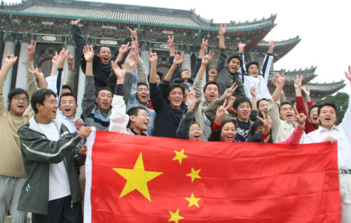上午9时9分52秒,当“神舟”六号载人飞船在酒泉卫星发射中心由长征二号F型运载火箭发射成功的消息传来时,河大顿时沸腾了,欢笑和掌声传遍了校园的每一个角落,同学们奔走相告,互相传递着这一喜讯。社团联合会的同学高举着国旗来到大礼堂广场,摇旗呐喊,喜悦与兴奋之情洋溢在每一个人脸上。