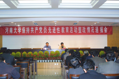 校党委书记、先进性教育活动领导小组组长张秉义同志就校级党政领导班子整改工作基本情况、整改方案落实情况以及进一步抓好整改工作的打算等向与会人员进行了通报。他说,我校先进性教育活动自9月1日转入整改提高阶段以来,在省委先进性教育活动领导小组的正确领导和省委督导组的精心指导下,学校党委认真组织,合理安排,制订了切实可行的整改方案,认真抓好了整改措施的落实,做到了整改任务明确具体,整改目标清清楚楚,整改责任层层落实,整改工作进展顺利,初见成效。随后,张秉义同志就整改方案涉及的教学科研工作和学科建设、管理和服务工作、党建工作、宣传思想政治工作、校级党政领导班子自身建设等5个大的方面和18项具体事项的整改情况向大家作了具体翔实的通报。