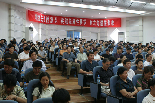2005年7月4日上午,我校在科技馆二楼报告厅召开保持共产党员先进性教育活动动员大会。省直机关纪工委书记、省委督导组组长彭世生,督导组成员耿守彦、吕建广、魏玮,校党政领导张秉义、关爱和、郑邦山、赵豫林、王发曾、赵振海、郭天榜、袁顺友、史全生、黄亚彬、赵国祥、梁晓夏,离退休校领导出席动员会。全校党员处级干部和非党员处级干部、机关党委所属全体党员以及各民主党派主要负责人参加大会。校长关爱和主持会议。