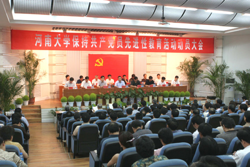 校党委副书记赵豫林同志在会上宣读了《河南大学保持共产党员先进性教育活动实施方案》。《实施方案》阐述了我校保持共产党员先进性教育活动的指导思想、基本原则、工作目标以及步骤要求。我校开展先进性教育活动的指导思想是,以邓小平理论和“三个代表”重要思想为指导,贯彻党的十六大和十六届三中、四中全会精神,树立和落实科学发展观,按照立党为公、执政为民的要求,坚持党要管党、从严治党的方针,紧密联系学校改革发展稳定工作实际和党员队伍建设现状,以学习实践“三个代表”重要思想为主要内容,引导广大党员学习贯彻党章,坚定理想信念,坚持党的宗旨,增强党的观念,发扬优良传统,认真解决党员和党组织在思想、组织、作风以及工作方面存在的突出问题,促进影响学校改革发展稳定、涉及教职工生切身利益的实际问题的解决,凝聚广大党员的智慧和力量,不断增强党员队伍和党组织的创造力、凝聚力、战斗力,为建设高水平的研究教学型大学、进而实现建设全国一流高校的目标提供坚强的政治保证和组织保证,为全面建设小康社会、实现中原崛起做出新的更大的贡献。我校的先进性教育活动从今年7月开始,到9月底基本结束,具体分学习动员、分析评议、整改提高三个阶段进行。学习动员阶段重点抓好思想发动、集中学习培训、开展新时期共产党员保持先进性具体要求的专题讨论、组织党员认真自学、小结转段五个环节,其主要任务是学习文件、统一思想、提高认识、增强素质;分析评议阶段:重点抓好广泛征求意见、开展谈心活动、撰写党性分析材料、召开专题组织生活会、召开支委会提出对每个党员的评议意见、向党员反馈意见、通报评议情况、小结转段八个环节,其主要任务是党性分析、民主评议、查摆问题、对照检查;整改提高阶段重点抓好制定整改方案、认真进行整改、公布整改情况、认真搞好总结表彰四个环节,其主要任务是针对问题、抓好整改、制定措施、见诸行动。之后,用2到3个月的时间,做好巩固提高工作。按照中央和省委提出的“提高党员素质,加强基层组织、服务人民群众、促进各项工作”要求,结合学校实际,《实施方案》还对先进性教育活动提出了5点意见:1、明确责任,加强领导。2、把握政策,搞好正面引导。3、结合实际,坚持分类指导。4、扩大覆盖面,不留空白点。5、促进发展稳定,创建和谐校园。