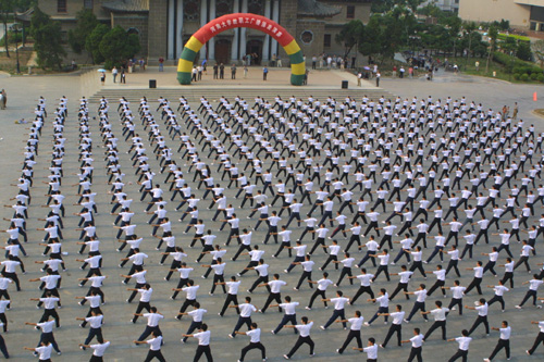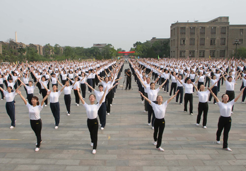 表演开始了,广播中洪亮有力的口令和音乐响起,600多名教职工动作熟练,随着舒展整齐的动作,一起一伏,气势恢弘,犹如大海上的一艘战舰,破浪前进,给人以一种绝美的艺术享受,充分体现了广播操运动优美可观的特色和我校教职工饱满的精神风貌。郑邦山同志高度赞扬了这次活动的意义。