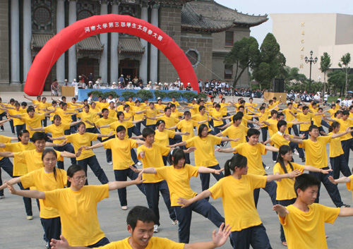 5月26日下午, 我校第三届学生太极拳大赛在明伦、金明两校区同时举行,共有来自各学院的20个代表队4000余人参赛。副校长赵国祥、郭天榜分别在两个校区的开幕式上讲话并兴致勃勃地观看了比赛。校学生处、公共体育教研部和各院领导以及由精干体育教师组成的裁判队伍也出席了开幕式。