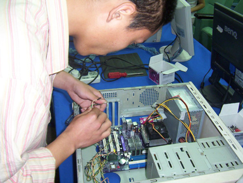 5月15日下午,2005年春季英特尔全国校园巡展走进河大,为同学们带来了一场丰富的科技大餐。来自明伦校区的27名计算机爱好者于科技馆一楼报告厅参加了“英特尔之夜”。选手们从容镇定,将零散的配件组装在一起,直至计算机成功启动,充分展示了他们对计算机结构的熟练掌握及较强的动手能力。通过激烈角逐。来自外语学院的孙进斌以57秒的成绩夺得第一名,周丹江与任远辉名列二、三名。