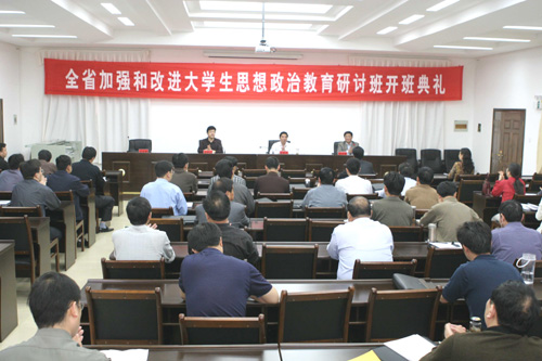 5月10日上午,全省加强和改进大学生思想政治教育研讨班(学工部长班)开班典礼在我校新校区干部培训中心举行。省教育厅社政处处长陈垠亭、办公室主任张艳华,我校党委副书记郑邦山、常务副校长王发曾及宣传部负责同志等出席开班典礼。典礼由郑邦山同志主持。
