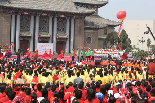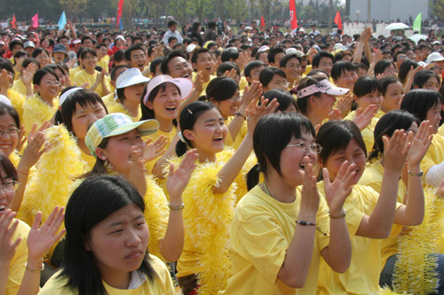 “所有的日子,所有的日子都来吧,让我编织你们。用青春金线,和幸福的缨络,编织你们……”2005年4月24日下午,这首激励了几代青年、昂扬豪迈的青春之歌在我校响起。由河南电视台“沟通无限”和“星登陆”主办、河南大学协办的2005年“五四”青年节特别节目——“青春如歌”在我校大礼堂广场举行,8000多名师生一起感受青春的激情与梦想。我校领导张秉义、郑邦山、王发曾、袁顺友、赵国祥等观看了节目。