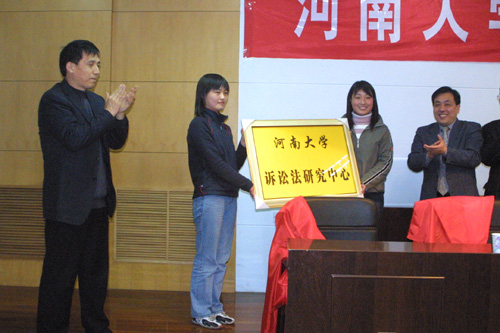 2005年3月29日下午,河南大学诉讼法研究中心揭牌仪式在新行政楼第四会议室举行。我校校长关爱和,著名法学专家张卫平、贺卫方、范忠信、王健,原法律系主任吴祖谋,法学院院长陈景良,诉讼法研究中心主任吴泽勇出席揭牌仪式。揭牌仪式由法学院党总支书记王明锁主持。