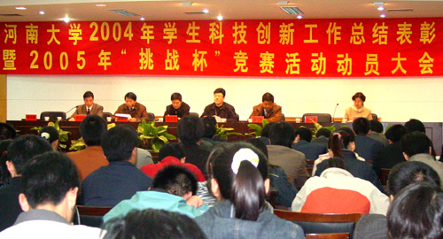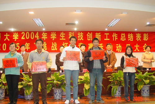 张保国、扈涛、张顺利三位同志首先宣读了《河南大学关于表彰2004年学生科技创新工作先进集体和个人的决定》等文件和首届中国青少年科技创新奖获奖名单。在热烈的气氛中,郑邦山等同志向获奖单位和个人颁发了奖金与证书。