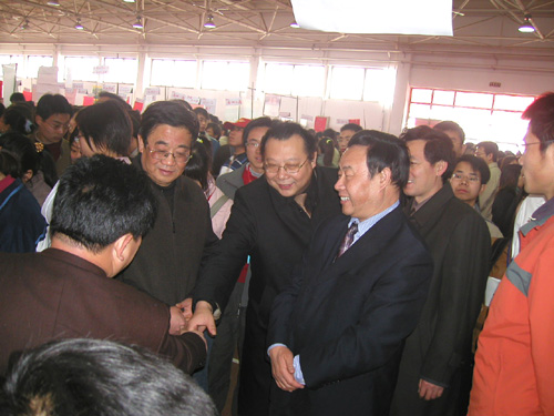 正在洽谈会如火如荼地进行的时候,心系毕业学子和就业工作的校领导们亲临现场视察指导工作。校党委书记张秉义、副书记郑邦山,副校长王发曾、赵国祥一行来到会场,他们仔细询问用人单位的招聘情况,还和毕业生亲切交谈,鼓励他们要充满信心、着眼长远。在池州学院的展台前,张秉义同志还向该单位的代表介绍了我校的概况,张秉义同志说:“历史悠久的河南大学欢迎你们下次再来。”会后,来自省外的用人单位代表们参观了我校校史馆和新校区,河南大学悠久的历史和近百年来的发展,给代表们留下了深刻的印象。